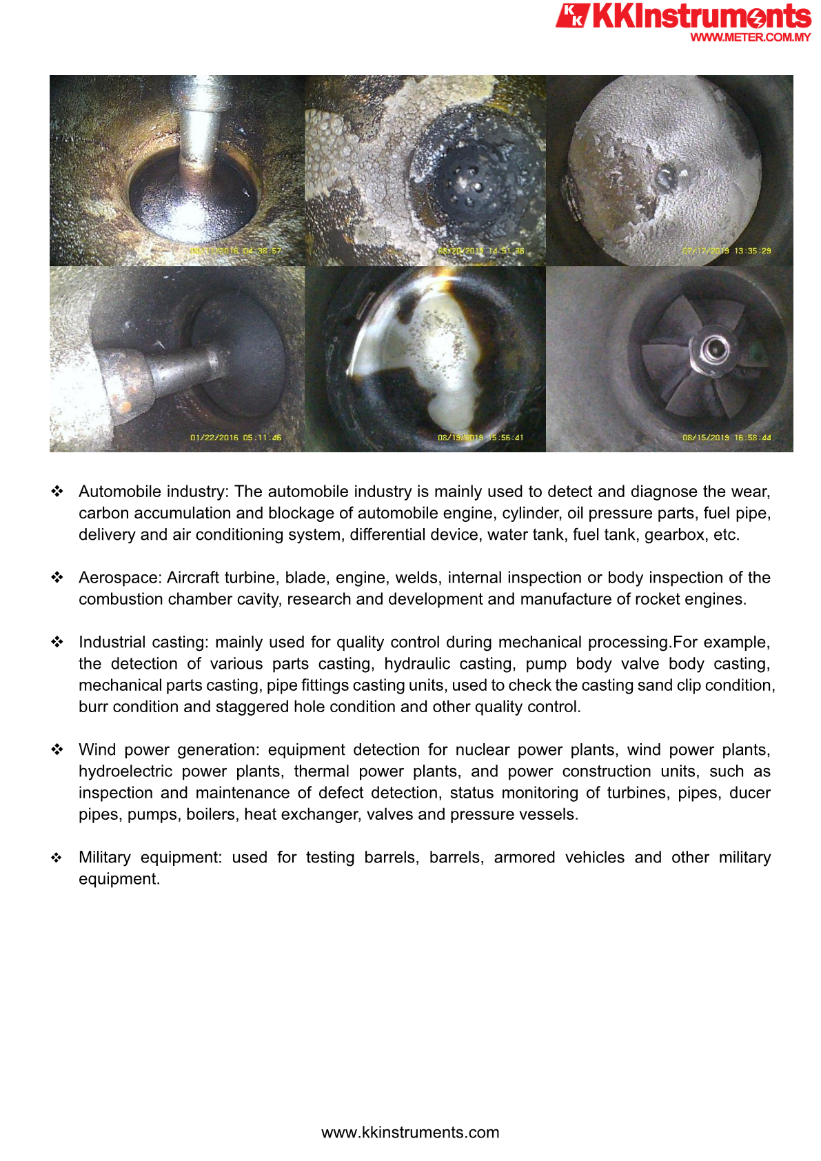 - Automobile industry: The automobile industry is mainly used to detect and diagnose the wear, carbon accumulation and blockage of automobile engine, cylinder, oil pressure parts, fuel pipe, delivery and air conditioning system, differential device, water tank, fuel tank, gearbox, etc.