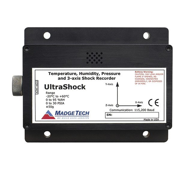 The UltraShock is a battery powered, stand alone temperature, pressure, humidity and tri-axial shock data logger. The UltraShock measures and records data for temperature, pressure and humidity at user selectable reading rates, while shock/acceleration data is sampled at 512Hz and at the user-specified reading rate, writes the peak acceleration (g force) to memory.