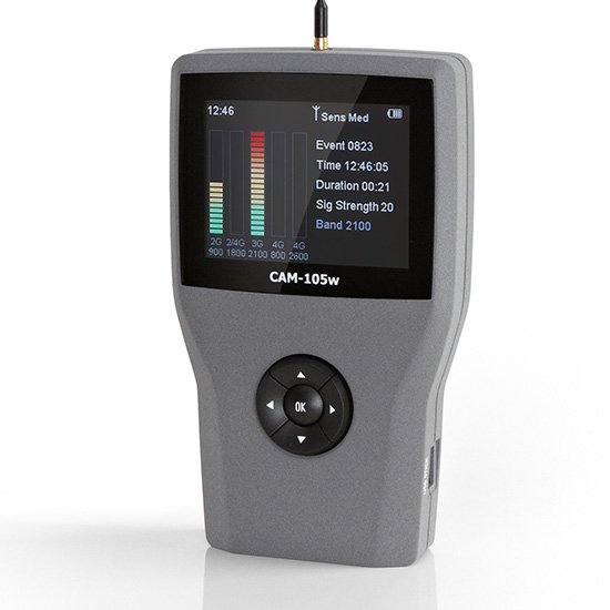 It offers unprecedented levels of detection in a handheld unit and logs all cellular activity within range. The CAM-105w will detect signals from existing 900 MHz (2G), 1800 MHz (2G/4G), 2100 MHz (3G), plus the new 4G Cellular bands 800 MHz (4G LTE) and 2600 MHz (4G LTE). Multiple high gain amplifiers ensure detection up to 50 meters depending on signal strength and ambient conditions.