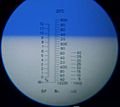 3) Look through the eyepiece. Read the boundary line where the blue and the white color meet. This is the Brix(%)