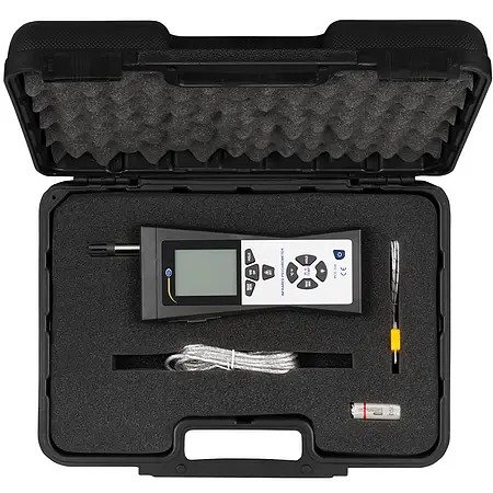 With the thermo hygrometer it is possible to measure climate conditions such as temperature and relative humidity, as well as determining surface temperature of objects simultaneously by using the included external temperature sensor or using an infrared measurement. The thermo hygrometer offers features such as average value, maximum, minimum, and hold functions. The thermo hygrometer provides additional information relating to dew point temperature and the global humidity temperature. Measurement values can be directly seen on the device's LCD display, and maximum and minimum values can be registered or transferred to a PC or portable computer for further analysis.