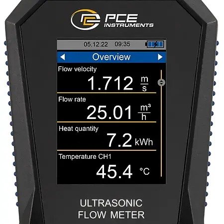 In order to determine the amount of heat with the ultrasonic flow meter, two additional thermocouples are required. These are available with the PCE-TDS 200+. The two thermocouples of the ultrasonic flow meter are connected to the flow and return of a pipe system. Based on the temperature difference and the measured flow rate, the ultrasonic flow meter can determine the amount of heat. If required, the ultrasonic flow meter can calculate and display the costs per unit of heat simultaneously during the measurement. Thus, the ultrasonic flow meter is used, for example, in the inspection of heating systems.