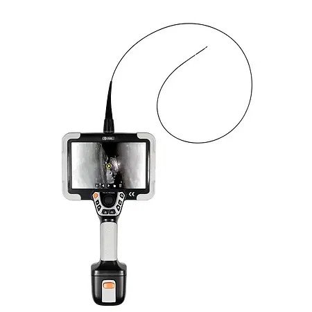 The real-time image displayed by the videoscope on the 7-inch display not only allows the user to check the object condition at the particular location, but also provides good orientation when the endoscope cable moves. LEDs located next to the camera can be switched on in steps to improve the visibility of the displayed area. Brightness, contrast and resolution of the display can be adjusted to the respective situation via the corresponding function menu. The camera is not installed in the direction of the cable axis, but at a 90-degree angle to it. The highest image sharpness is achieved for the objects in the range of 5 to 50 mm distance.