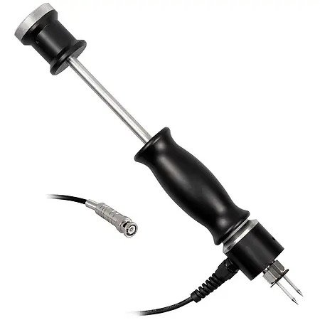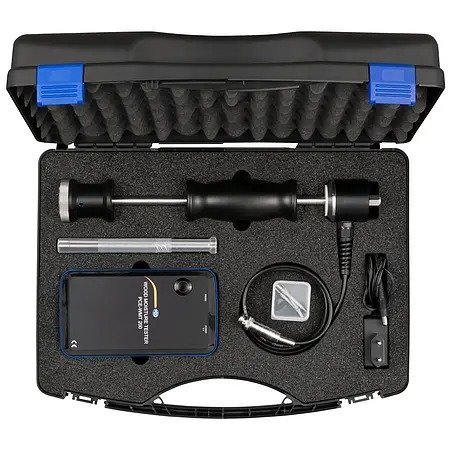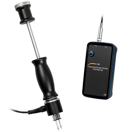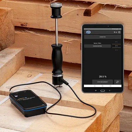 With the Bluetooth wood timber moisture meter, up to 44 different types of wood can be checked for their moisture content. These include 36 hardwoods and 8 conifers, such as beech, spruce, pine and maple. The measured value can be up to 150% moisture in relation to the dry matter. In order to obtain the most precise measurement possible, the Bluetooth timber moisture meter has both automatic and manual temperature compensation between -20 ... 50°C / -4 ... 122°F. In order to carry out a measurement, a pair of measuring tips is first knocked into the wood with the help of the ram electrode on the Bluetooth timber moisture meter. Two different pairs of measuring tips are available for the Bluetooth timber moisture meter. With the pair of needles 45 x Ø3.05 mm, you can drive into the wood up to a depth of 30 mm.