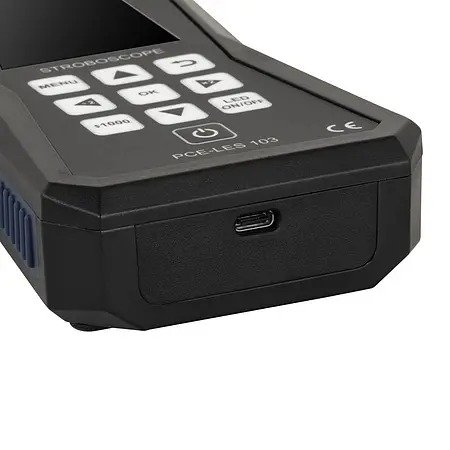 The stroboscope is operated intuitively using the 10 buttons, allowing quick adjustments to be made. The phase shift allows the observation point to be moved variably. The pulse width can be used to set the duration and therefore also the intensity of the flash frequency. The display brightness can be selected in the settings menu, as can switching off the display after a period of inactivity, which extends the battery life. The stroboscope is supplied with a USB-C charging cable in a service bag.