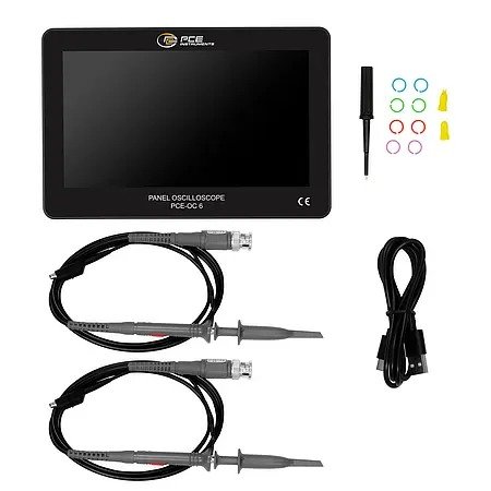 The scope of delivery includes two 100 MHz probes and accessories as well as a power supply unit with data cable. This makes the Oscilloscope perfect for analysing and diagnosing signal interference in circuits, power supply units or control units as well as in the development of electronic components.