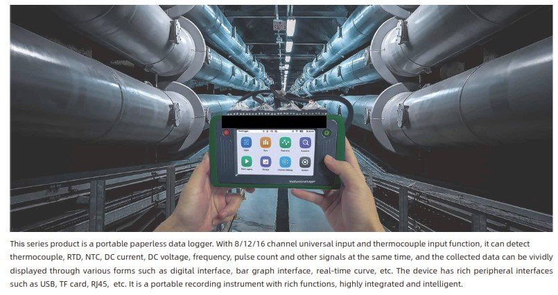 This series product is a portable paperless data logger. With 8/12/16 channel universal input and thermocouple input function, it can detect thermocouple, RTD, NTC, DC current, DC voltage, frequency, pulse count and other signals at the same time, and the collected data can be vividly displayed through various forms such as digital interface, bar graph interface, real-time curve, etc. The device has rich peripheral interfaces such as USB, TF card, RJ45, WIFI, etc. It is a portable recording instrument with rich functions, highly integrated and intelligent.