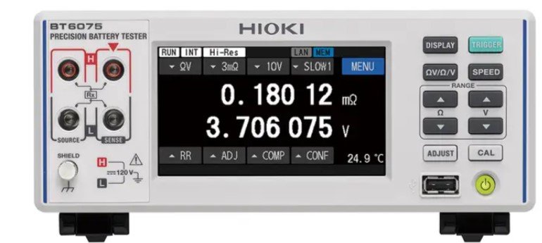 The Hioki Precision Battery Tester BT6075 is designed for OCV/AC-IR testing of high-capacity EV battery cells with low internal resistance.