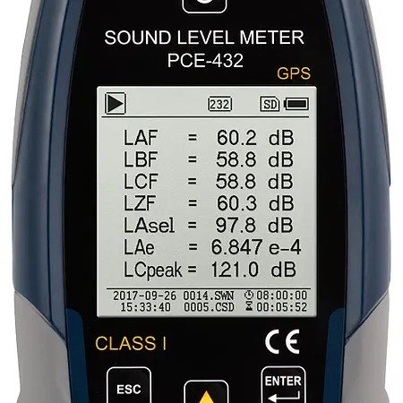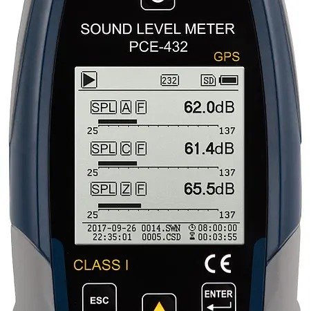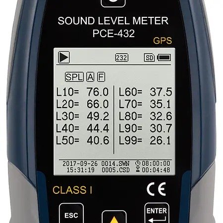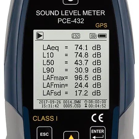 PCE-432 is a class 1 data-logging sound level meter that meets IEC 60651:1979, IEC 60804:2000, IEC 61672-1:2013, ANSI S1.4-1983 and ANSI S1.43-1997 requirements. This portable high-accuracy sound level meter is equipped with GPS functionality, allowing measured values to be assigned to an exact geographic location.