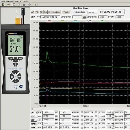 With the thermo hygrometer it is possible to measure climate conditions such as temperature and relative humidity, as well as determining surface temperature of objects simultaneously by using the included external temperature sensor or using an infrared measurement. The thermo hygrometer offers features such as average value, maximum, minimum, and hold functions. The thermo hygrometer provides additional information relating to dew point temperature and the global humidity temperature. Measurement values can be directly seen on the device's LCD display, and maximum and minimum values can be registered or transferred to a PC or portable computer for further analysis.