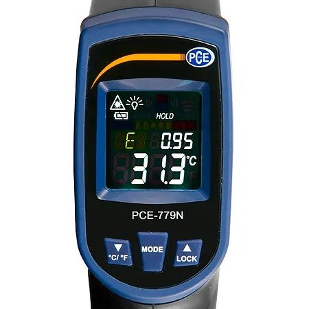 The infrared thermometer PCE-779N can be used for quick temperature measurements. This can be done in two different ways: either without contact or by means of a thermocouple. The infrared thermometer is suitable for nearly all surfaces. Since the infrared thermometer allows non-contacting measurement, even high temperatures can be measured from a safe distance. By means of the integrated dual laser of the infrared thermometer PCE-779N, the user can target the measuring spot very precisely.