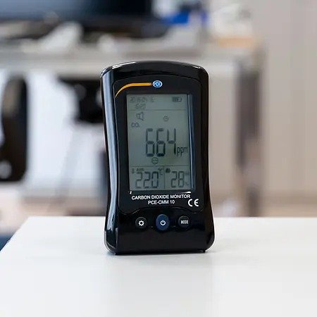 CO2 meter / Battery operation / Alarm limits / 400 ... 5000 ppm / Temperature measurement / Visual and acoustic alarm / Automatic switch-off / USB charging / Units can be changed / LC display / Temperature range -10 ... 50°C (4 ... 122°F)