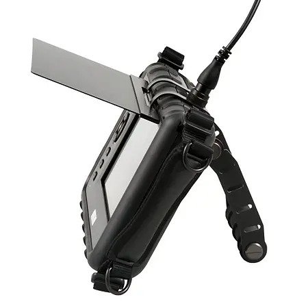 Especially in places that are difficult to access, the two-way optics is a great advantage of the videoscope. However, if the control of the camera head is not sufficient and images on the display can not be shown satisfactorily, there is still the possibility to rotate the images on the display of the handset at a 90° angle. In addition to the image rotation, various other functions can also be set on the handset itself. For example, the videoscope allows a digital zoom as well as the setting of the LED brightness of the camera head. The videoscope has a thread at the back which allows the user to position the main unit on a tripod to carry out permanent recordings. The automatic switch-off function can be activated or deactivated in the menu by the videoscope. In addition, when the automatic switch-off is activated, different time intervals between 5 and 30 minutes can be selected. In addition to the tripod, the main unit can also be comfortably held by the padded shoulder straps.