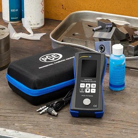 The thickness gauge has a data memory on which the measured values ​​can be recorded. After a measurement sequence, the stored measurement values ​​can be analyzed directly on the thickness gauge. The stored data are graphically displayed by the thickness gauge. In addition, each individual measuring point can be approached and read in the graphics of the thickness gauge. For a simplified analysis of the measured values, the average, the largest and smallest measured value is displayed on the thickness gauge. The thickness gauge can optionally be equipped with an ISO calibration certificate.
