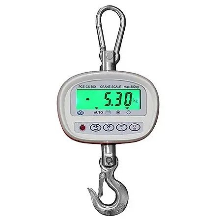 PCE-CS 300 is a digital, battery-powered Crane Scale for indoor use. The rugged design of the Crane Scale accommodates applications in rough industrial conditions as well as in fields such as food and hygiene. A stainless-steel, carabiner-style shackle, a zinc-coated hook, and an infrared remote control are included with the Crane Scale, as are six 1.5 V AA batteries. The Crane Scale comes factory calibrated, and, for an additional fee, the PCE-CS 300 can be calibrated according to ISO standards.