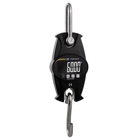 Crane scale with metal housing / Measuring range 0 ... 60 kg (0 ... 132 lbs) / Automatic shutdown after 15 minutes of inactivity / Battery operation / "HOLD" function / Digit height 22 mm / Units of mass kg, lb, N / Optional with ISO calibration certificate